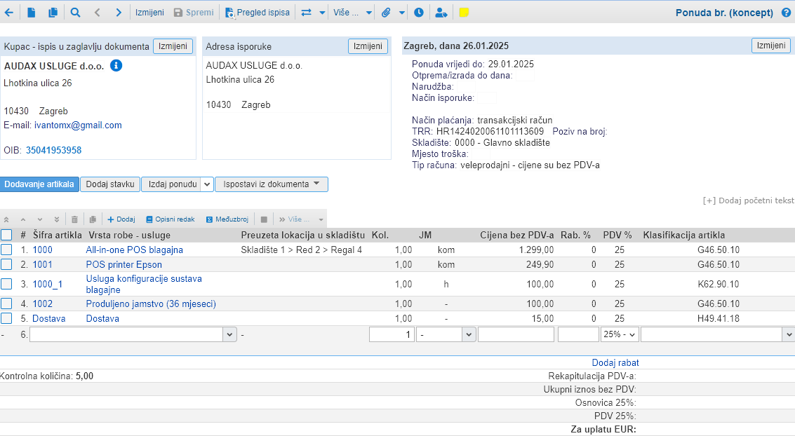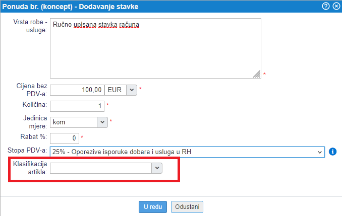 Ako imate bazu artikala (tzv. šifrarnik), preporučeno je da svakom artiklu dodijelite odgovarajuću KPD klasifikaciju. Nakon toga, svaki put kada na računu koristite taj artikl, KPD šifra će se automatski prenijeti.