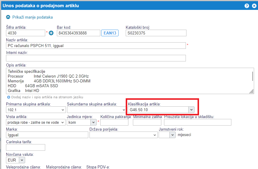 Nije ispravno artiklu dodijeliti klasifikaciju 46.50 koja sadrži samo 4 znamenke.