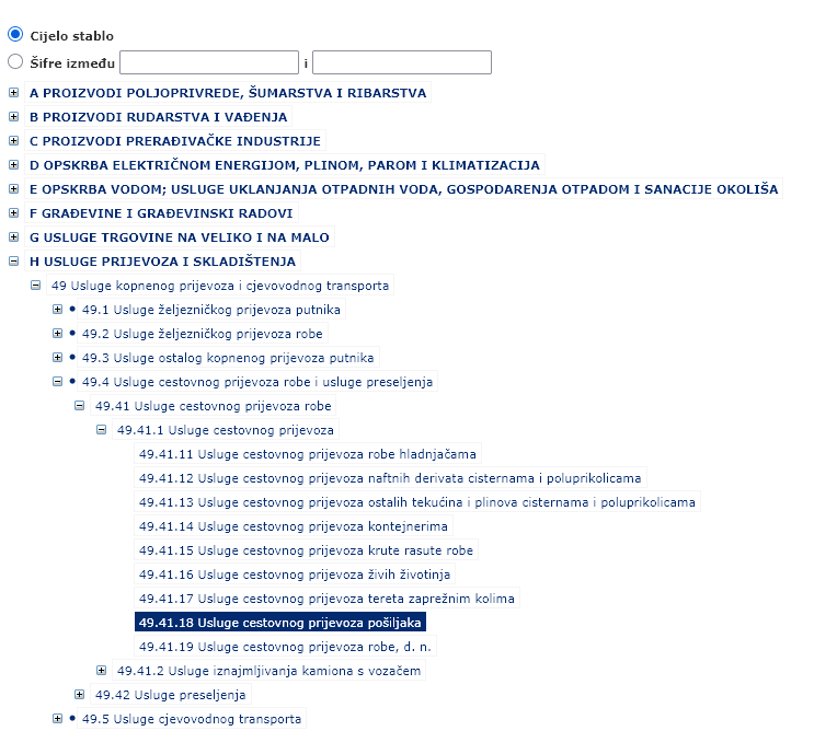 - Ako se radi o drugim (dodatnim) usluga, tražite sektor koji odgovara toj usluzi. Npr. za usluge dostave pretražujete sektor H (Usluge prijevoza i skladištenja).
