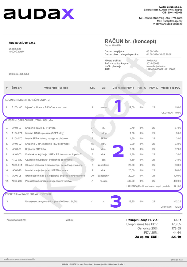Svaka tvrtka ima svoje specifične potrebe pa se cijena određuje u skladu s obuhvatom i složenosti računovodstvenih obrada. Naplatu usluga možemo dogovoriti u paušalnom iznosu ili obračunski (prema broju knjiženja).